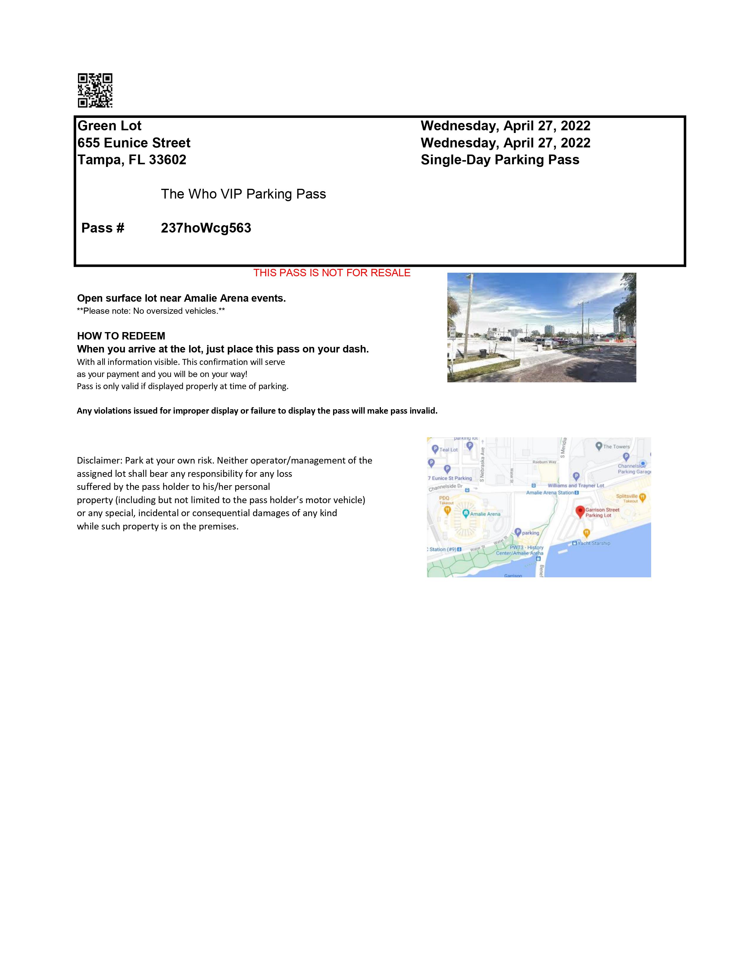 The Who - Amalie Arena - Green Lot Parking Pass